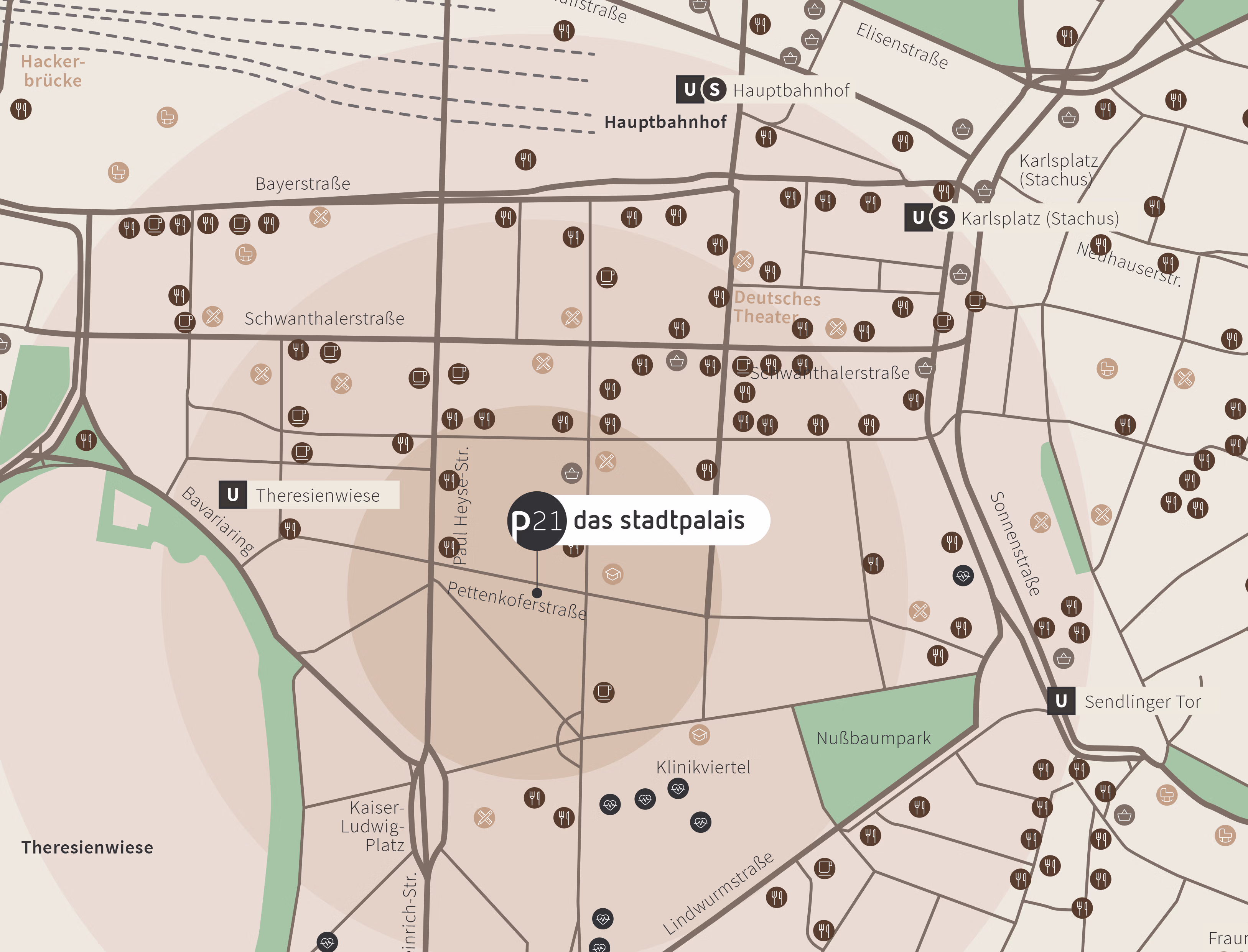 Das P21 – das stadtpalais profitiert von seiner erstklassigen Lage mit exzellenter Nahversorgung und direkter Anbindung an das dynamisch wachsende Hauptbahnhofsviertel, das sich zu einem der bedeutendsten Business-Distrikte Münchens entwickelt. Diese strategische Position bietet sowohl die Vorzüge urbaner Infrastruktur als auch die Nähe zu innovativen Entwicklungsprojekten, die das Quartier zu einem der zukunftsträchtigsten Standorte der Innenstadt machen.